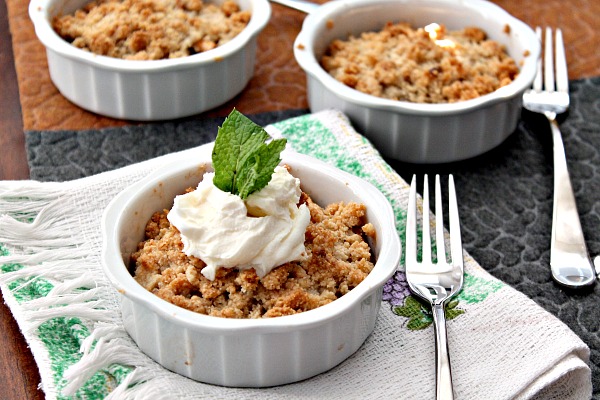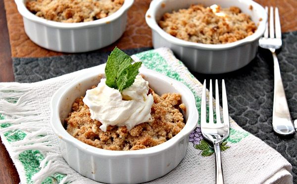 - Meng de appels met de uitgeknepen rozijnen en de kaneel en verdeel ze over de bodem van de ovenschaal(tjes). Kruimel het deeg erover heen en doe het geheel ongeveer 20 minuten in de oven