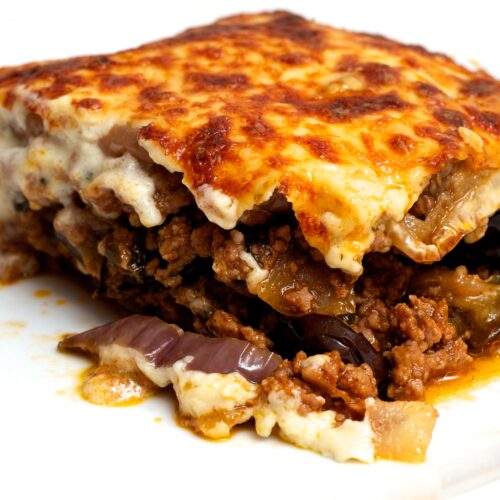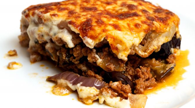 • Leg er een laag aardappelschijfjes in, vervolgens een laag uit/aubergine, het gehakt, weer een laag aardappelschijfjes en dan weer een laag ui/aubergine