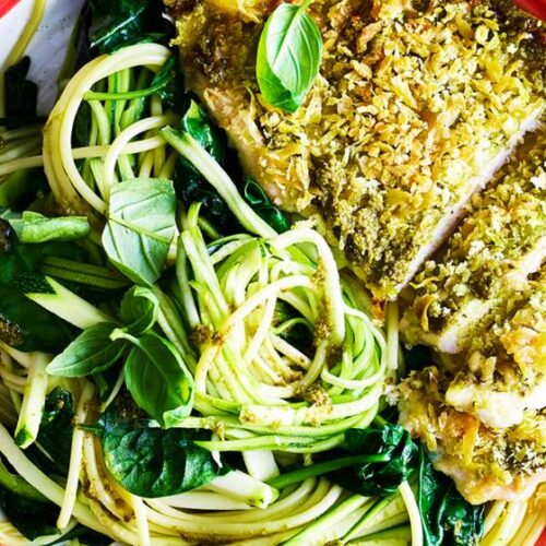 - Verdeel de kip over de over de ovenschaal en besmeer ze met 2 eetlepels pesto en bestrooi ze met het panko-kaasmengsel