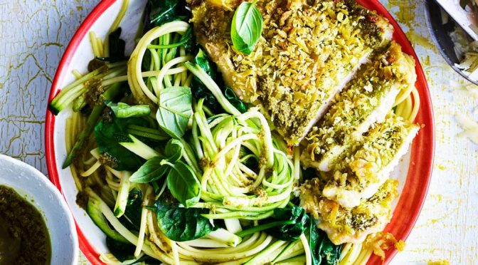 bron: https://www.ah.nl/allerhande/recept/R-R1190534/pasta-pesto-met-spinazie-en-krokante-kip-advertorial