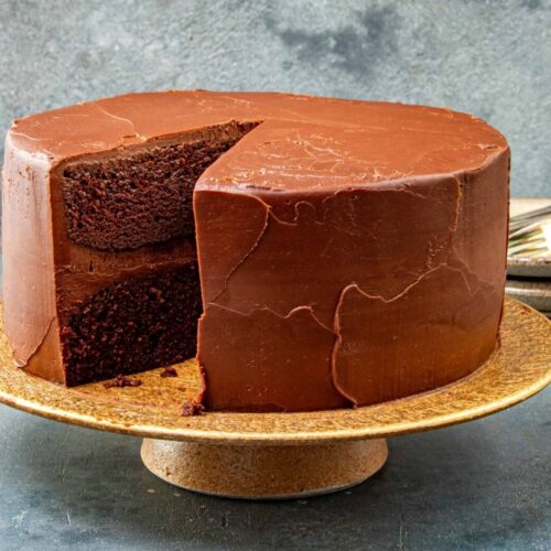 - Bestrijk een van de cakes met een laagje ganache en plaats de andere cake daar op zijn kop op, zodat de bovenkant mooi plat is. Bestrijk de taart aan de boven- en zijkant rijkelijk met de ganache. Laat de ganache opstijven in de koelkast. Haal de taart ruim voor het serveren weer uit de koelkast; op kamertemperatuur smaakt de devil’s food cake het lekkerst!