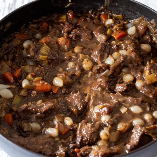 • Voeg de boter aan het vlees toe en laat de stoof nog even doorkoken.